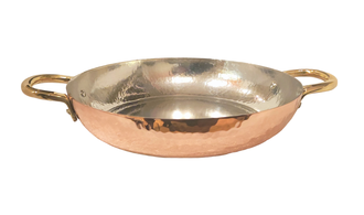 Внутри луженая оловом, ручки латунные. Предназначена для приготовления любых блюд. Также можно ставить в духовку и запекать. В таких сковородочках можно красиво сервировать стол.
