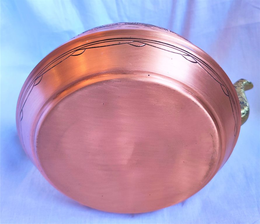 Внутри луженый оловом. Медь массивная, ручка деревянная, красивый латунный носик. Кустарная работа, резьба по меди.
