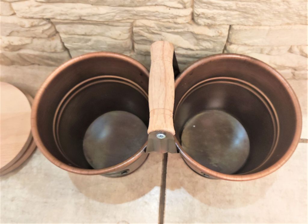 диаметр верха 15см, диаметр дна 10см, общая ширина двух ведер 30см, общая высота с ручкой 22см