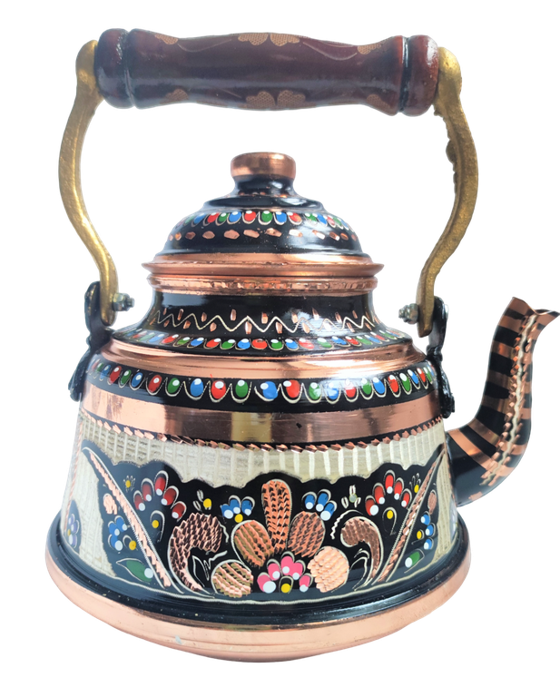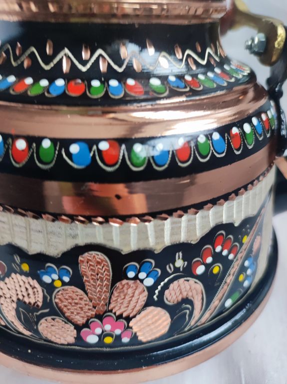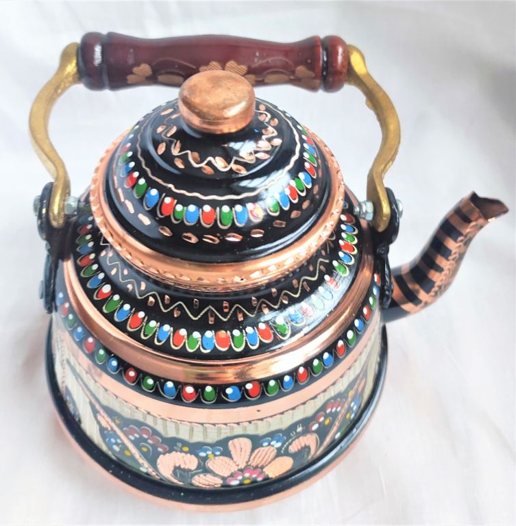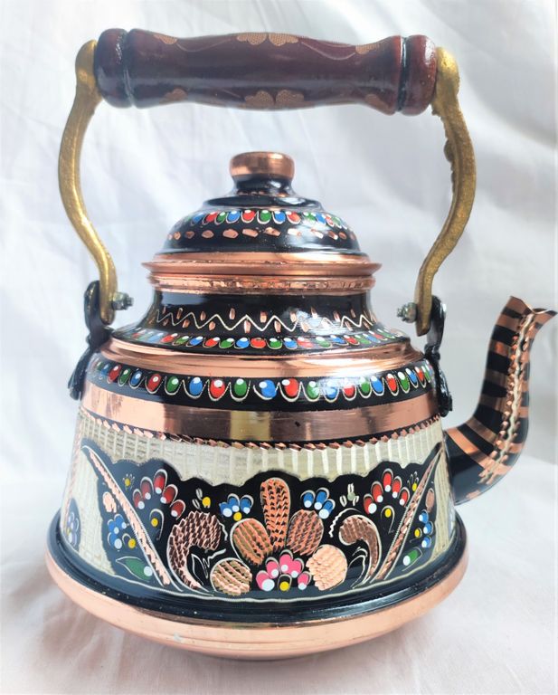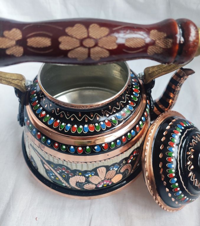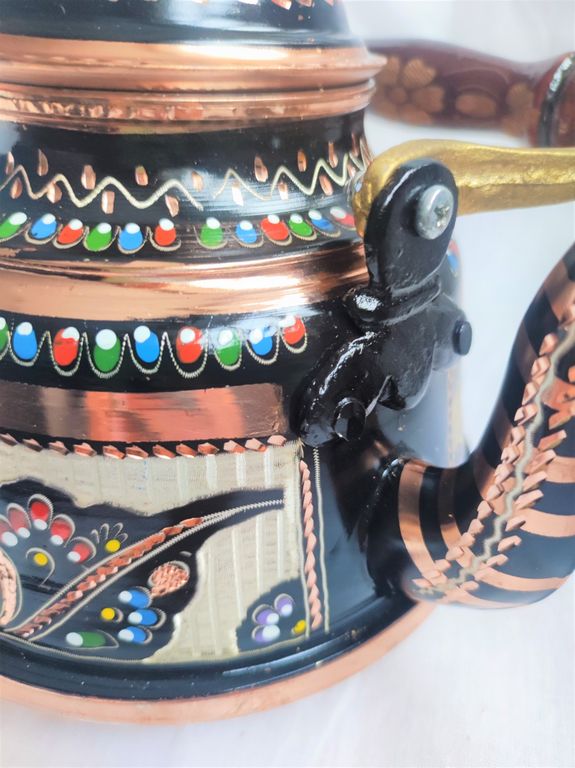 Изготовлен турецкими мастерами, резьба по меди, красочная эмаль создает особое настроение. Аутентичный, полностью ручная работа. Исполнение грубоватое. Дно чайника с небольшими вмятинками, что не влияет на его функциональные свойства.