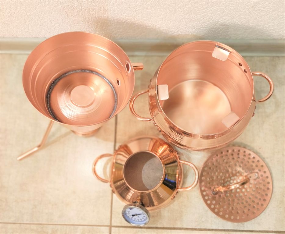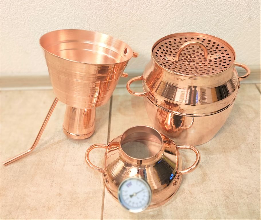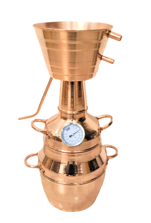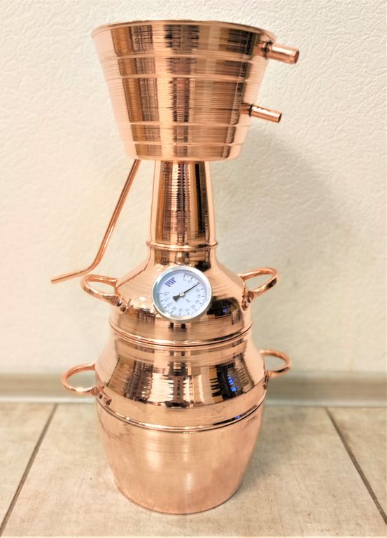 Состоит из трех частей в комплекте с термометром. Данная модель походит не только для производства гидролатов и эфирных масел, но и для дистилляции спиртных ароматных напитков (самогона). Компактная модель, работает по принципу аламбика с колонной.