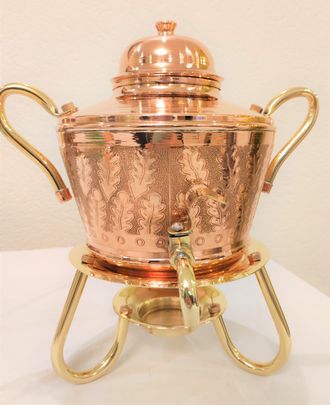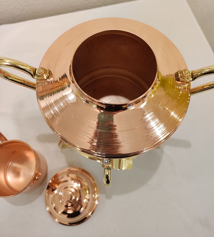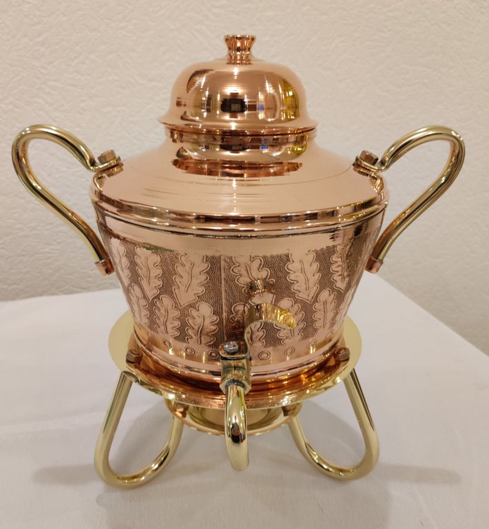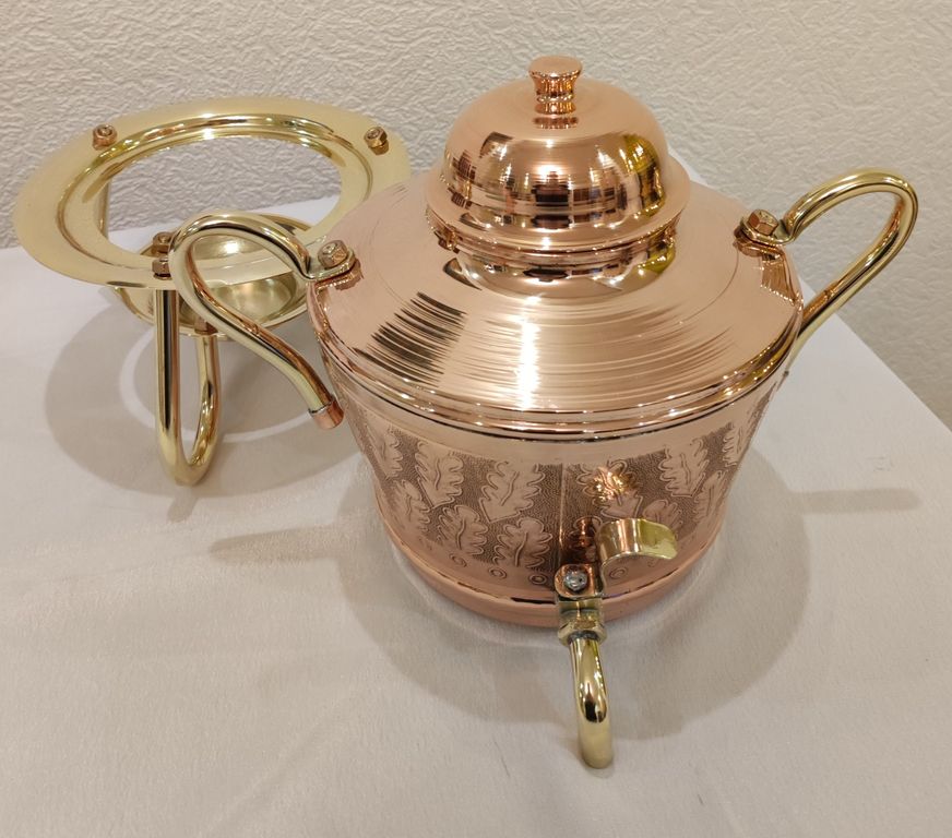 Произведена из пищевой российской меди марки М1 с нанесением чеканки, без лужения. Подставка латунная.