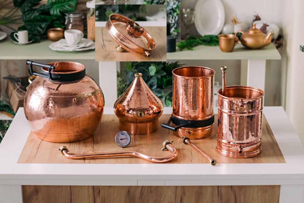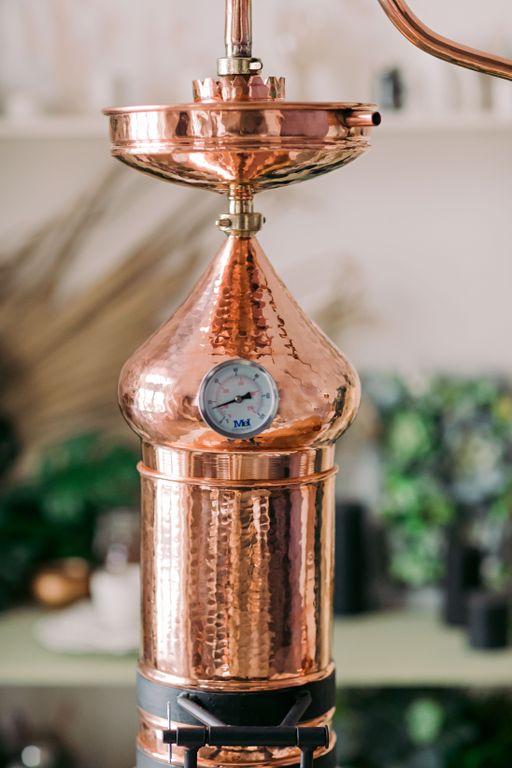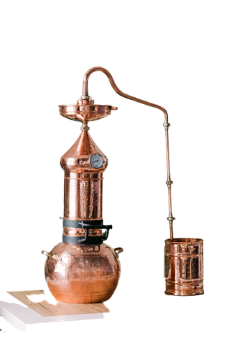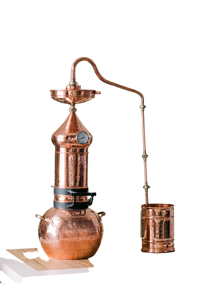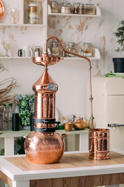 Аламбик с колонной выполнен методом сварки, толщина меди от 1 мм и больше. В комплект входит встроенный термометр, укрепляющая линза. Отвод для слива барды в моделях от 20л.