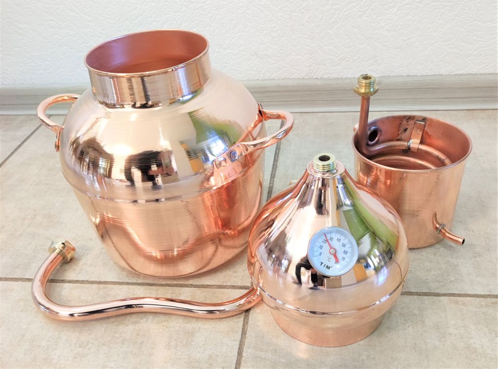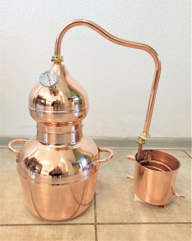 Изготовлен по аналогу португальского аламбика из чистой меди, пайка швов оловом без содержания свинца, в комплекте с термометром.